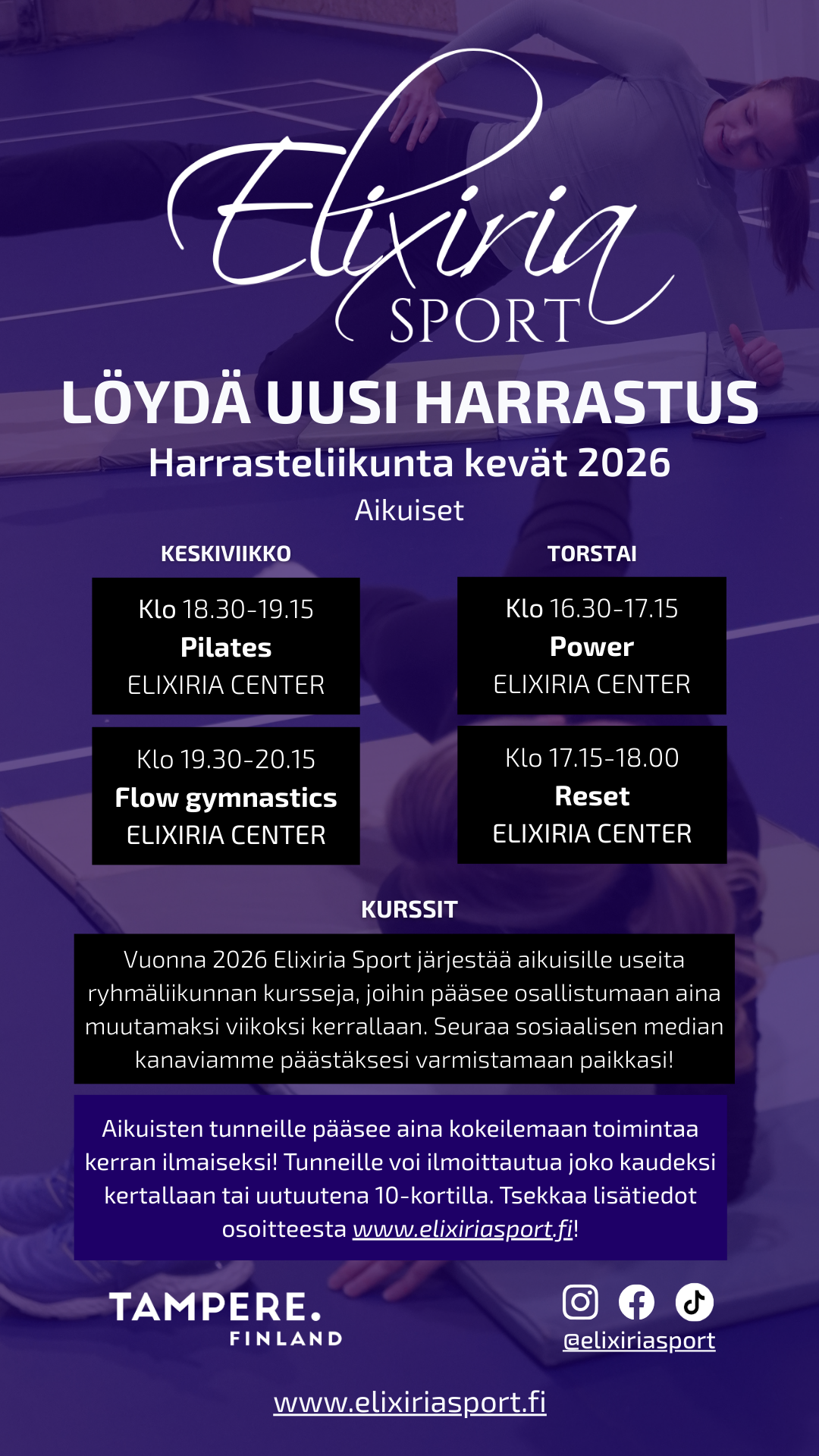 Elixiria Sportin aikuisten harrasteliikunnan ryhmiä perustetaan kysynnän ja tarpeen mukaisesti. Tunneilla liikutaan hyvällä meiningillä ja energiaa arkeen lisäten.